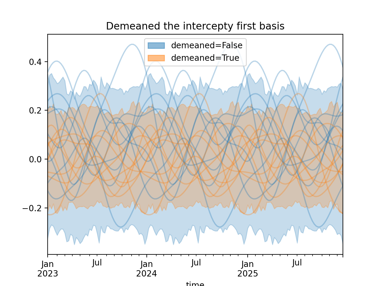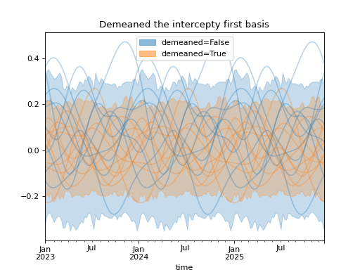 import numpy as np import pandas as pd import xarray as xr import matplotlib.pyplot as plt from pymc_marketing.mmm import HSGPPeriodic from pymc_marketing.plot import plot_curve seed = sum(map(ord, "Periodic GP")) rng = np.random.default_rng(seed) scale = 0.25 ls = 1 kwargs = dict(ls=ls, scale=scale, period=52, cov_func="periodic", dims="time", m=20) n = 52 * 3 dates = pd.date_range("2023-01-01", periods=n, freq="W-MON") X = np.arange(n) coords = {"time": dates} hsgp = HSGPPeriodic(demeaned_basis=False, **kwargs).register_data(X) hsgp_demeaned = HSGPPeriodic(demeaned_basis=True, **kwargs).register_data(X) def sample_curve(hsgp): return hsgp.sample_prior(coords=coords, random_seed=rng)["f"] non_demeaned = sample_curve(hsgp).rename("False") demeaned = sample_curve(hsgp_demeaned).rename("True") combined = xr.merge([non_demeaned, demeaned]).to_array("demeaned") _, axes = combined.pipe(plot_curve, "time", same_axes=True) axes[0].set(title="Demeaned the intercepty first basis") plt.show()