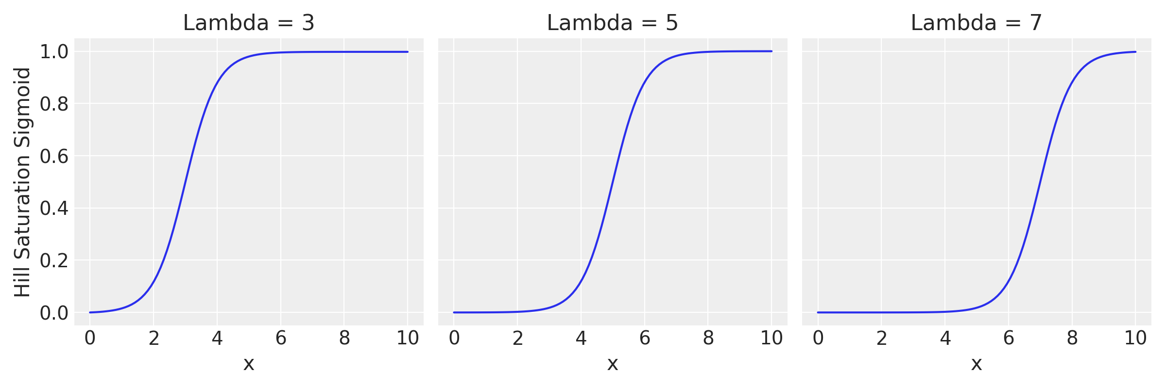 This function computes the Hill sigmoidal response curve, which is commonly used to describe the saturation effect in biological systems. The curve is characterized by its sigmoidal shape, representing a gradual transition from a low, nearly zero level to a high plateau, the maximum value the function will approach as the independent variable grows large. In this implementation, we add an offset to the sigmoid function to ensure that the function always passes through the origin as we expect zero spend to result in zero contribution.