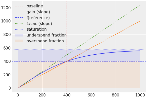 \(0.8\), you can still increase acquired users by \(50\%\) as much you get in the reference point by increasing the budget. \(x_0\) effect is 20% away from saturation point