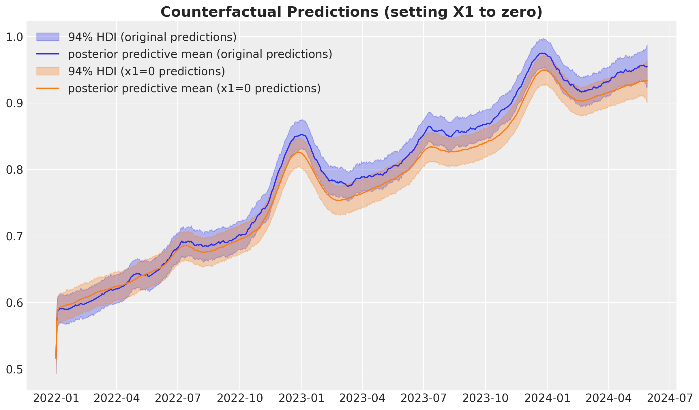 fill_kwargs={"alpha": 0.3, "label": r"$94\%$ HDI (x1=0 predictions)"},